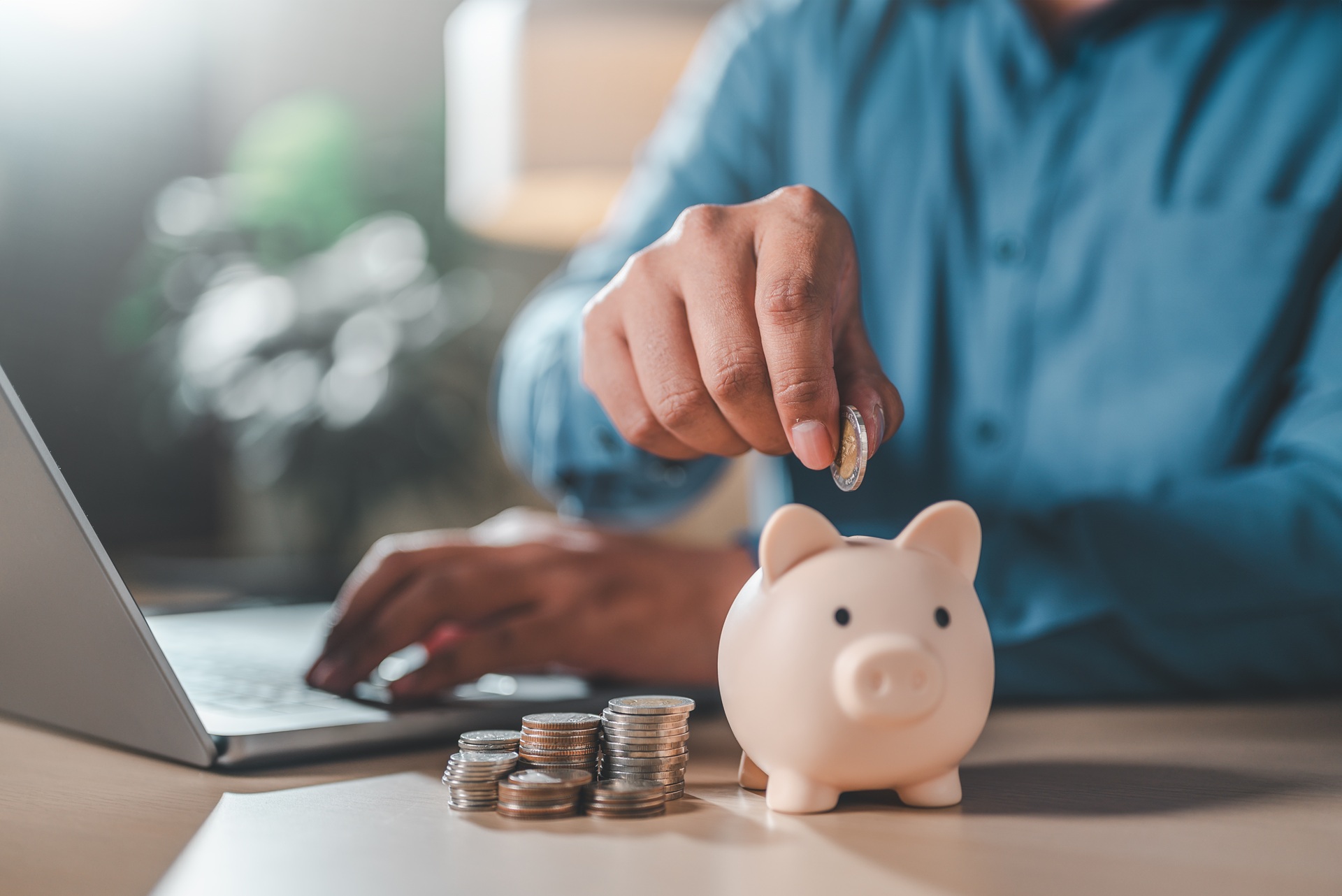 A person putting a coin into the top of a piggy bank while sitting in front of a laptop.